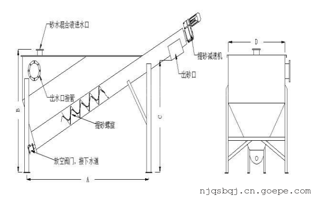 砂水混合物从分离器一端顶部输入水箱,混合液中重度较大的,如砂粒等将沉积于槽型底部,在螺旋的推动下,砂粒沿斜置的槽底提出升,离开液面后继续推移一段距离,在砂粒充分脱水后经排砂口卸至盛砂桶,而与砂水分离后的水从溢流口排出并送往厂内进水池